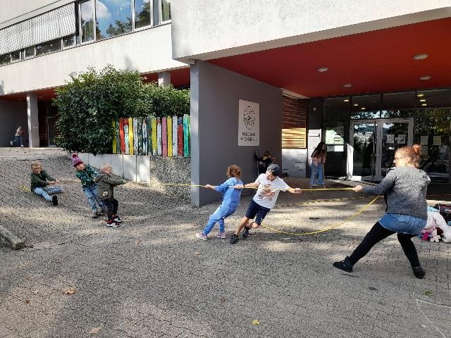 Im Oktober hatten die Teilnehmenden bei Spaß am Donnerstag den Pausenhof einen ganzen Nachmittag für sich. Wir haben Geräte aus dem Spielehäuschen, der Spieletonne und der Schulsozialarbeit getestet.